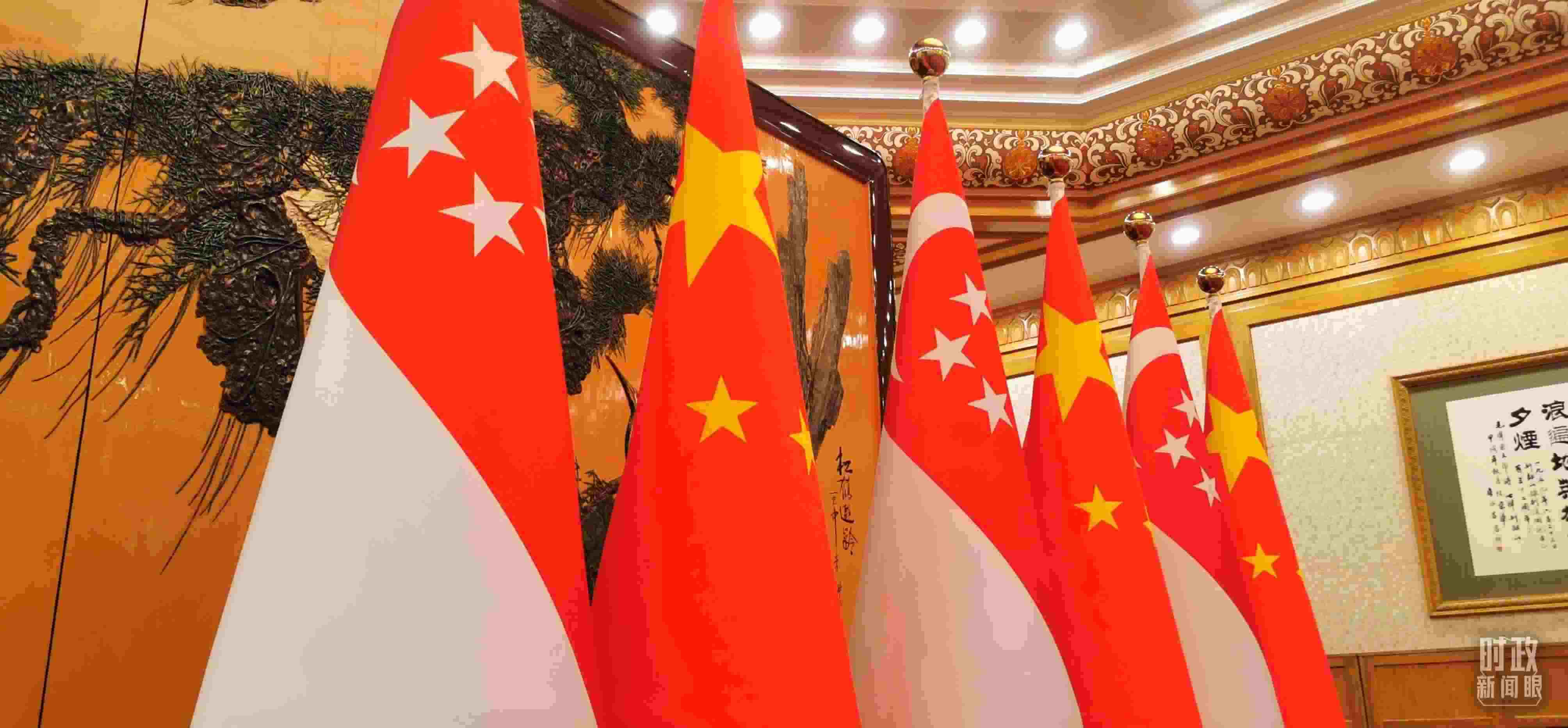 △會(huì)見(jiàn)現(xiàn)場(chǎng)的中新兩國(guó)國(guó)旗。(總臺(tái)央視記者李錚拍攝)