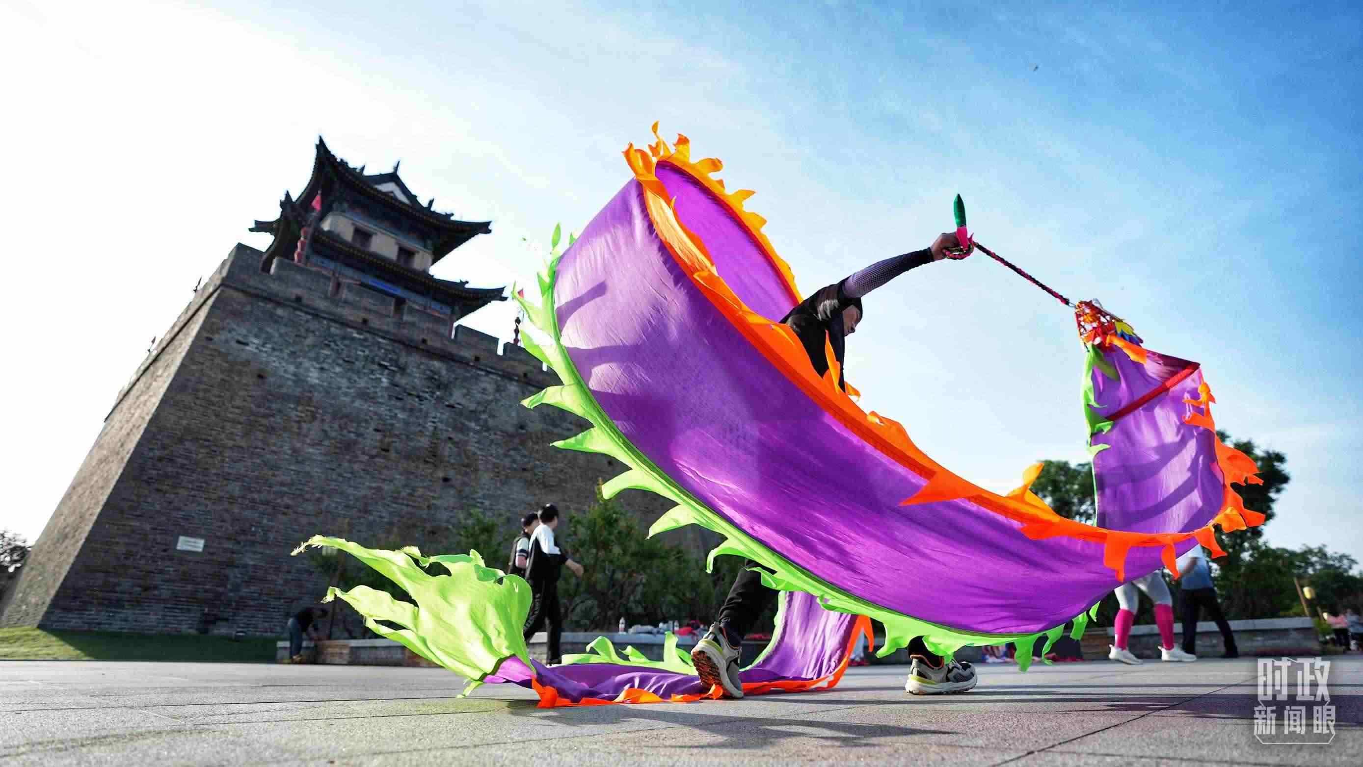 △ 清晨,西安市民在古城墻角樓下舞龍健身。(總臺(tái)國(guó)廣記者李晉拍攝)