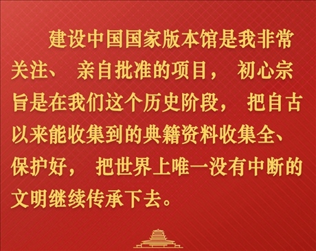 習(xí)近平強(qiáng)調(diào),建設(shè)中國(guó)國(guó)家版本館,是文明大國(guó)建設(shè)的基礎(chǔ)工程,是功在當(dāng)代、利在千秋的標(biāo)志性文化工程。