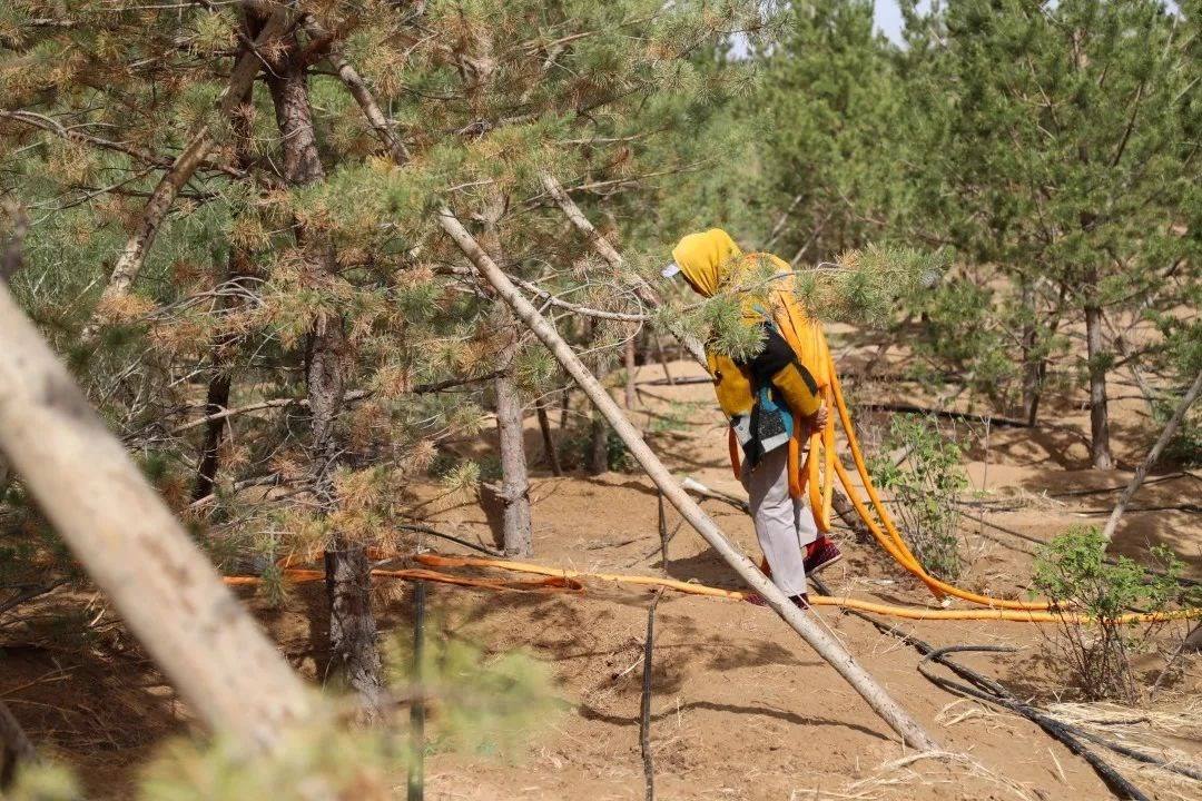 △2023年5月31日,治沙工人在庫布其沙漠億利生態(tài)治理區(qū)內(nèi)搬運(yùn)水管,準(zhǔn)備為樹木澆水。
