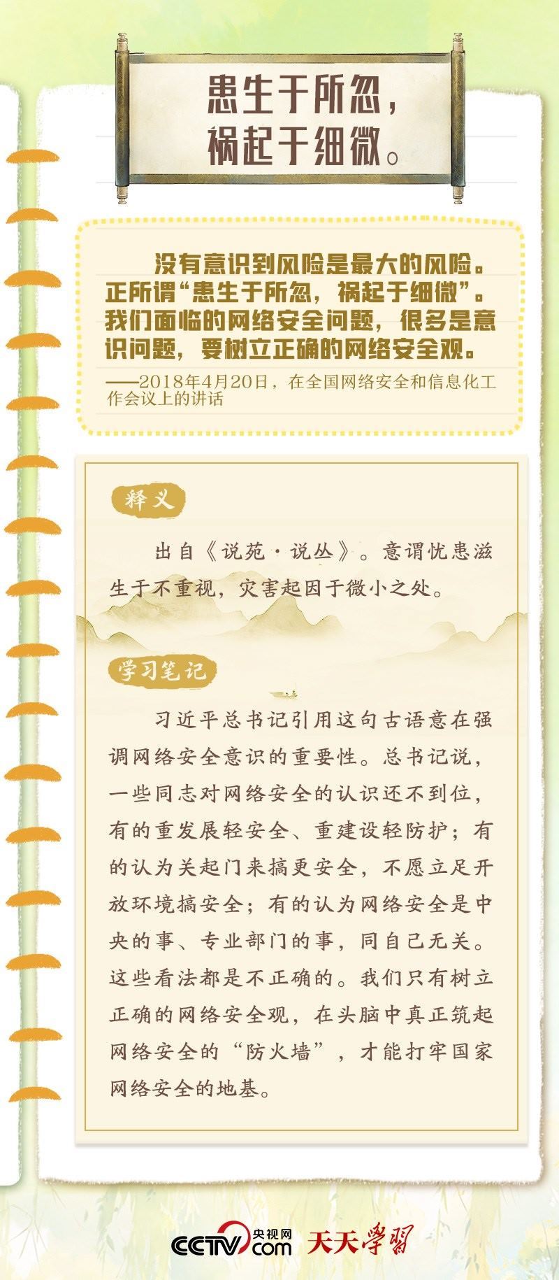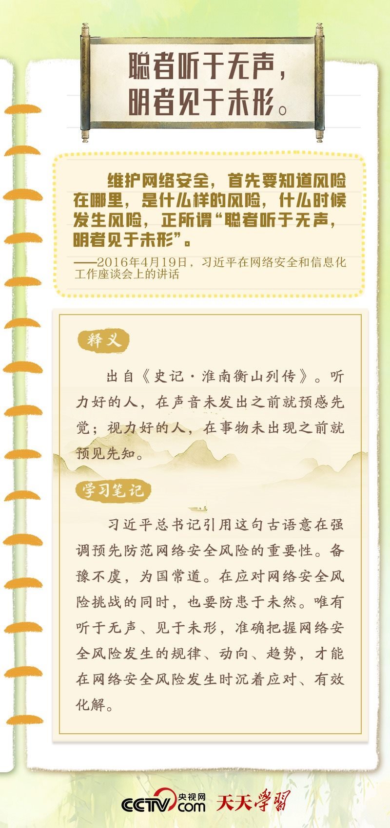 習近平總書記重視網絡安全工作,曾多次在講話中以典明理,深刻闡釋網絡安全工作的重要意義。“網絡安全宣傳周”到來之際,央視網《天天學習》特梳理總書記關于網絡安全的用典,與您一起學習領悟。
