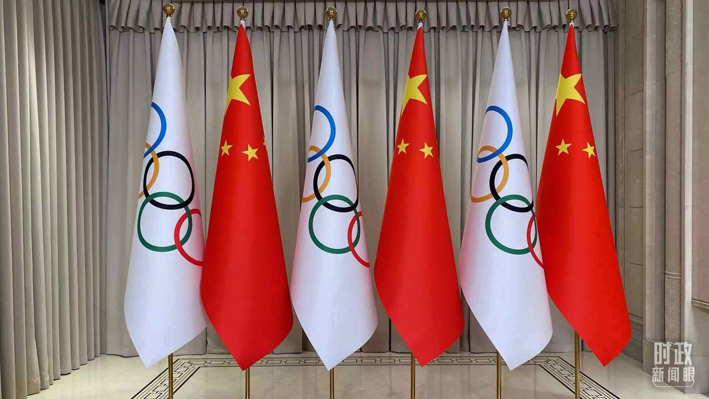 △會(huì)見(jiàn)現(xiàn)場(chǎng)擺放的中國(guó)國(guó)旗和奧林匹克會(huì)旗。(總臺(tái)央視記者李增仁拍攝)
