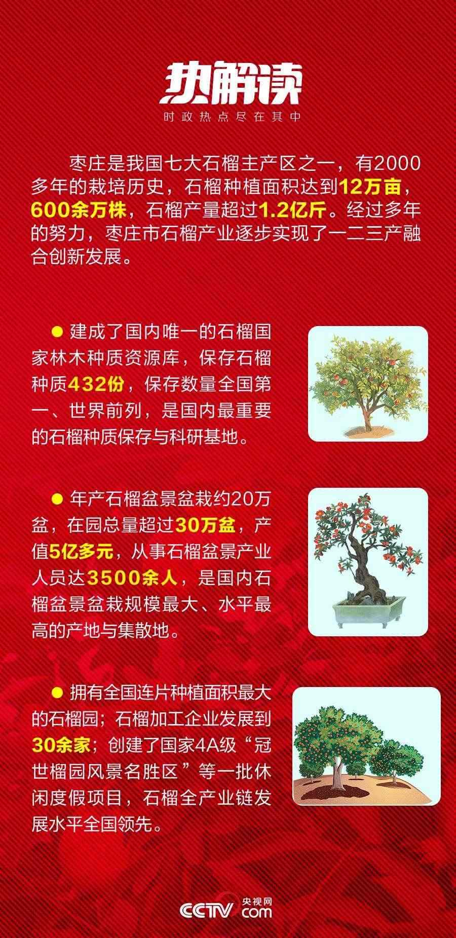 歷經(jīng)千年,當(dāng)年自異域“舶來”的奇珍異果,已經(jīng)成為遍地開花的致富果、幸福果。山東棗莊火紅的石榴給這座小城帶來了紅火的發(fā)展機(jī)遇,也給老百姓帶來了紅火的生活。