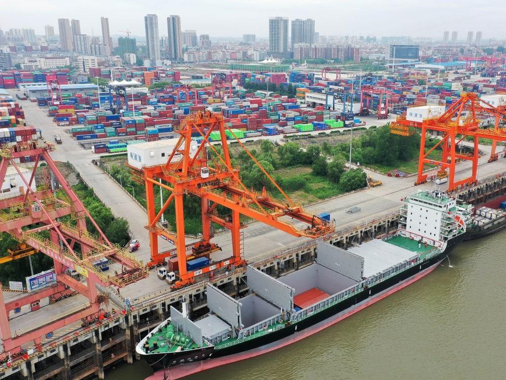 “華航漢亞2號”貨輪??吭谖錆h新港陽邏集裝箱碼頭進行裝箱作業(yè)(2020年5月9日攝,無人機照片)。新華社發(fā)(趙軍 攝)