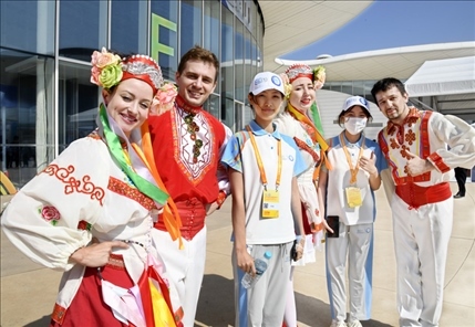 △6月15日,來(lái)自白俄羅斯的演員在表演結(jié)束后與志愿者合影。當(dāng)日,上海合作組織產(chǎn)業(yè)鏈供應(yīng)鏈論壇暨2023上合國(guó)際投資貿(mào)易博覽會(huì)在青島開(kāi)幕。