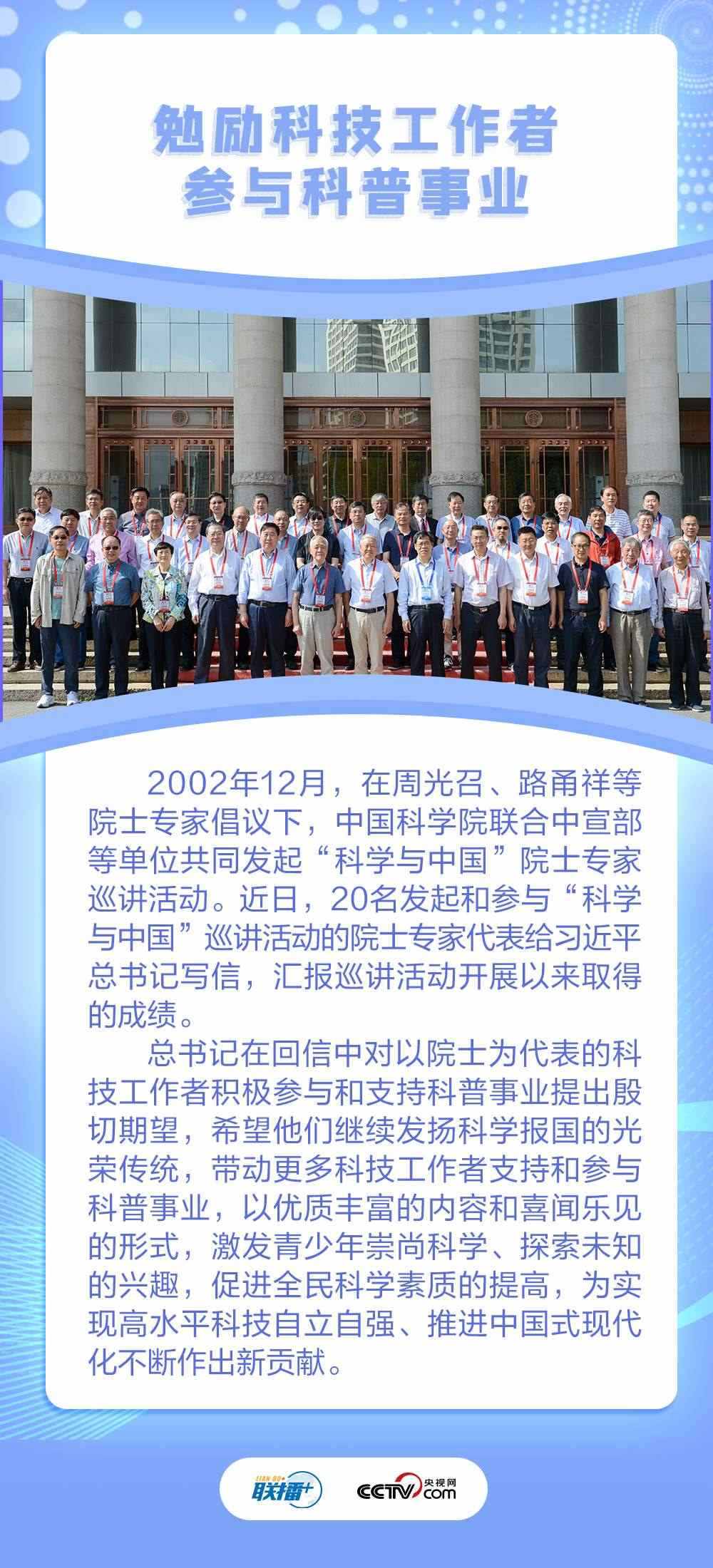 7月20日,習(xí)近平總書(shū)記給“科學(xué)與中國(guó)”院士專家代表回信。他在回信中強(qiáng)調(diào),科學(xué)普及是實(shí)現(xiàn)創(chuàng)新發(fā)展的重要基礎(chǔ)性工作,并對(duì)科技工作者支持和參與科普事業(yè)提出殷切期望。