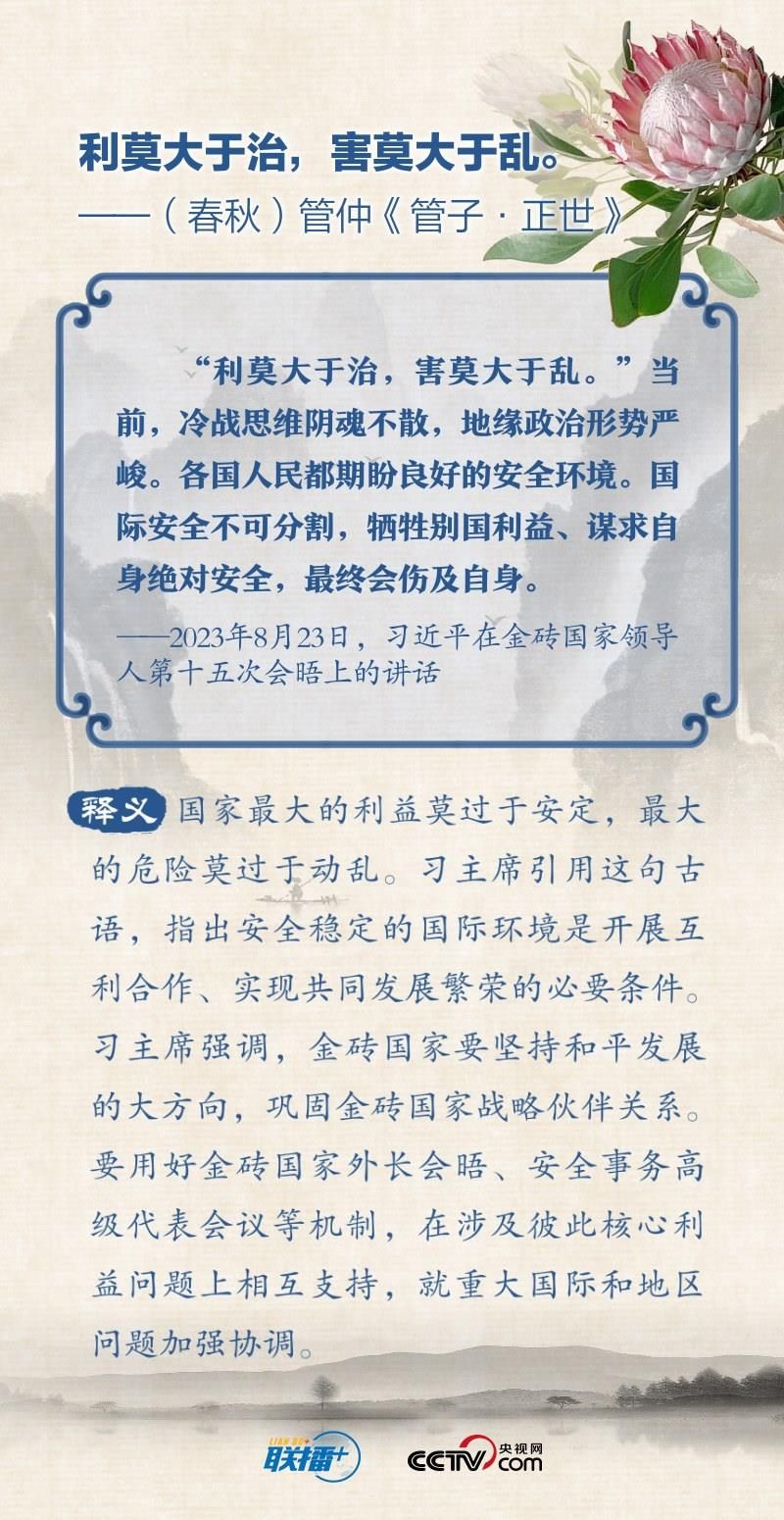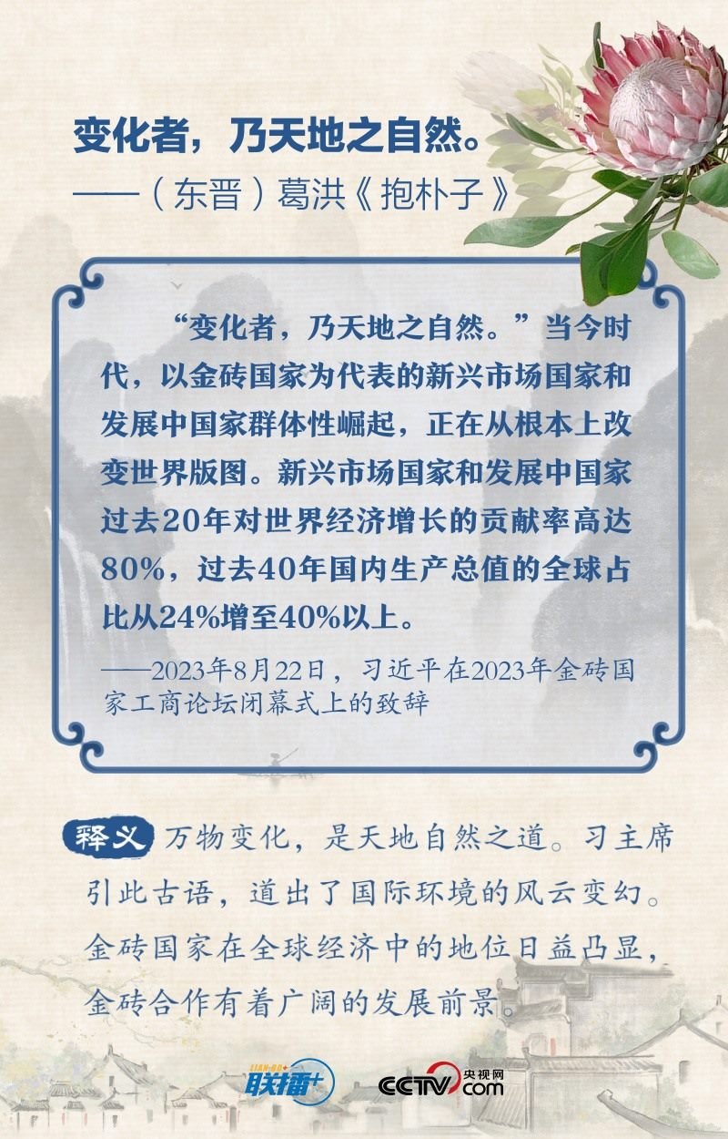 “順理而舉易為力,背時(shí)而動(dòng)難為功”“變化者,乃天地之自然”“利莫大于治,害莫大于亂”…… 2023年的“金磚時(shí)間”里,習(xí)近平主席多次在講話(huà)中引經(jīng)據(jù)典,闡述金磚國(guó)家的合作與發(fā)展之道。央視網(wǎng)《聯(lián)播+》特?cái)X取習(xí)主席用典金句,與您一起學(xué)習(xí)。