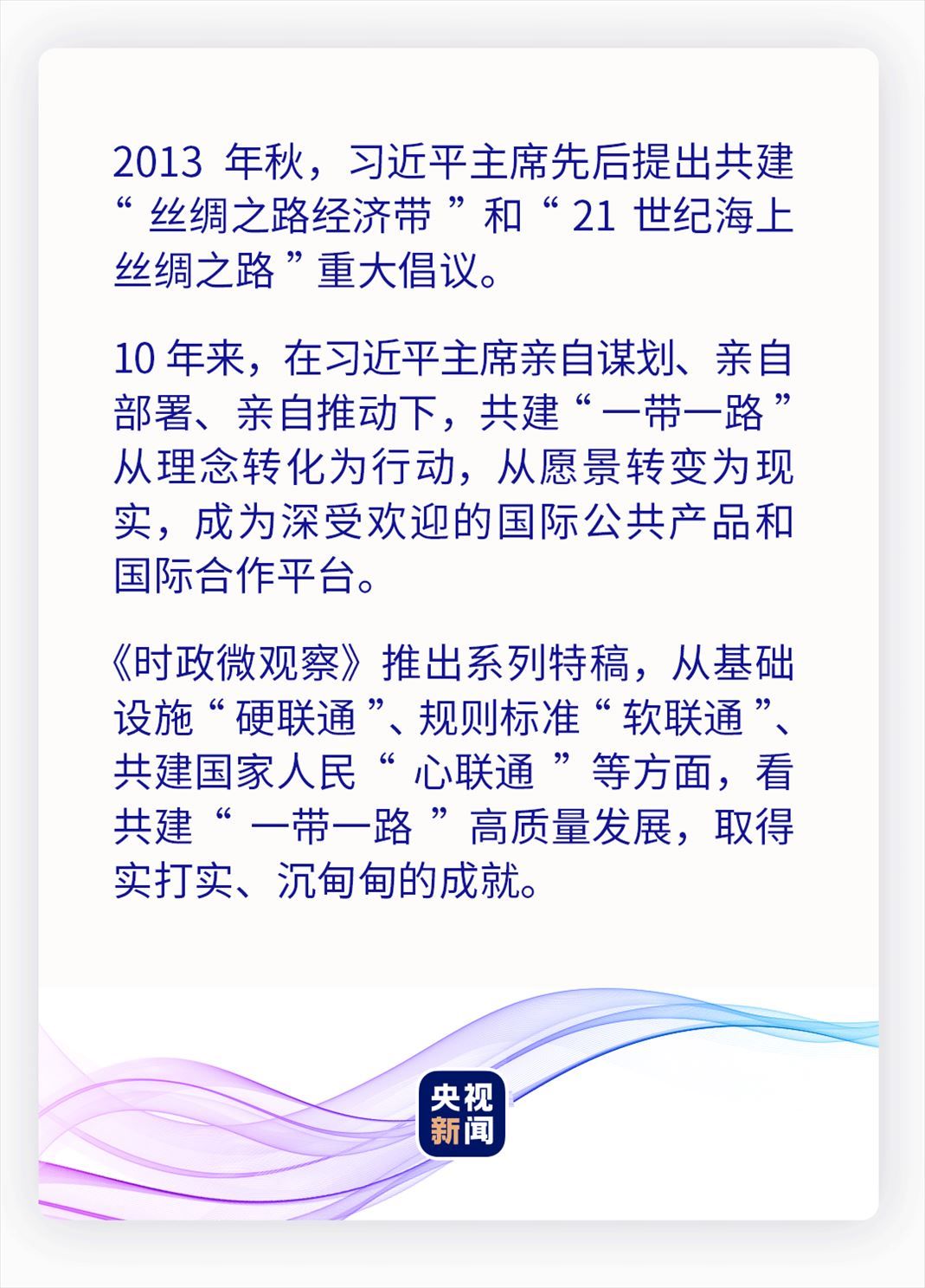 10年來,中國與共建國家以基礎設施“硬聯通”為重要方向,攜手前行。在“鋼鐵駝隊”的汽笛聲里、在跨海大橋上的車流中、在“空中絲綢之路”的萬米高空、在“數字絲綢之路”的“云端”……一條條幸福路、繁榮路,鋪就一幅共建“一帶一路”的壯闊畫卷。