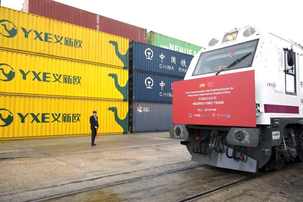 △2023年3月9日,以“中西建交紀念號”特別命名的“義新歐”中歐班列從馬德里鳴笛發(fā)車,與從義烏同時開出的列車雙向而行。
