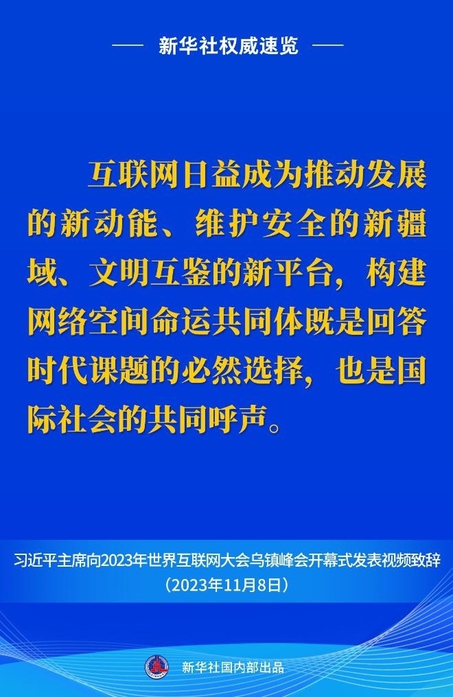 11月8日上午,國家主席習(xí)近平向2023年世界互聯(lián)網(wǎng)大會烏鎮(zhèn)峰會開幕式發(fā)表視頻致辭。一起來看金句。