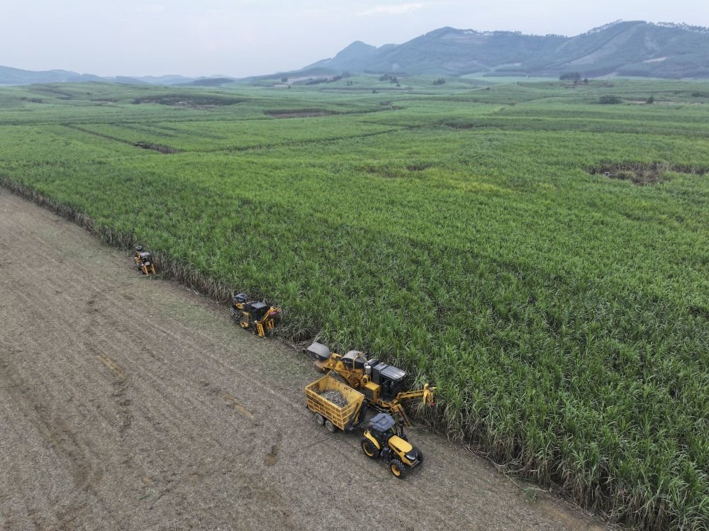 不遠(yuǎn)處,幾臺(tái)甘蔗收割機(jī)隆隆作響。當(dāng)?shù)弥笮透收崾崭顧C(jī)一天能收割180噸至200噸甘蔗,相當(dāng)于180個(gè)人工的工作量,總書記連連稱贊。