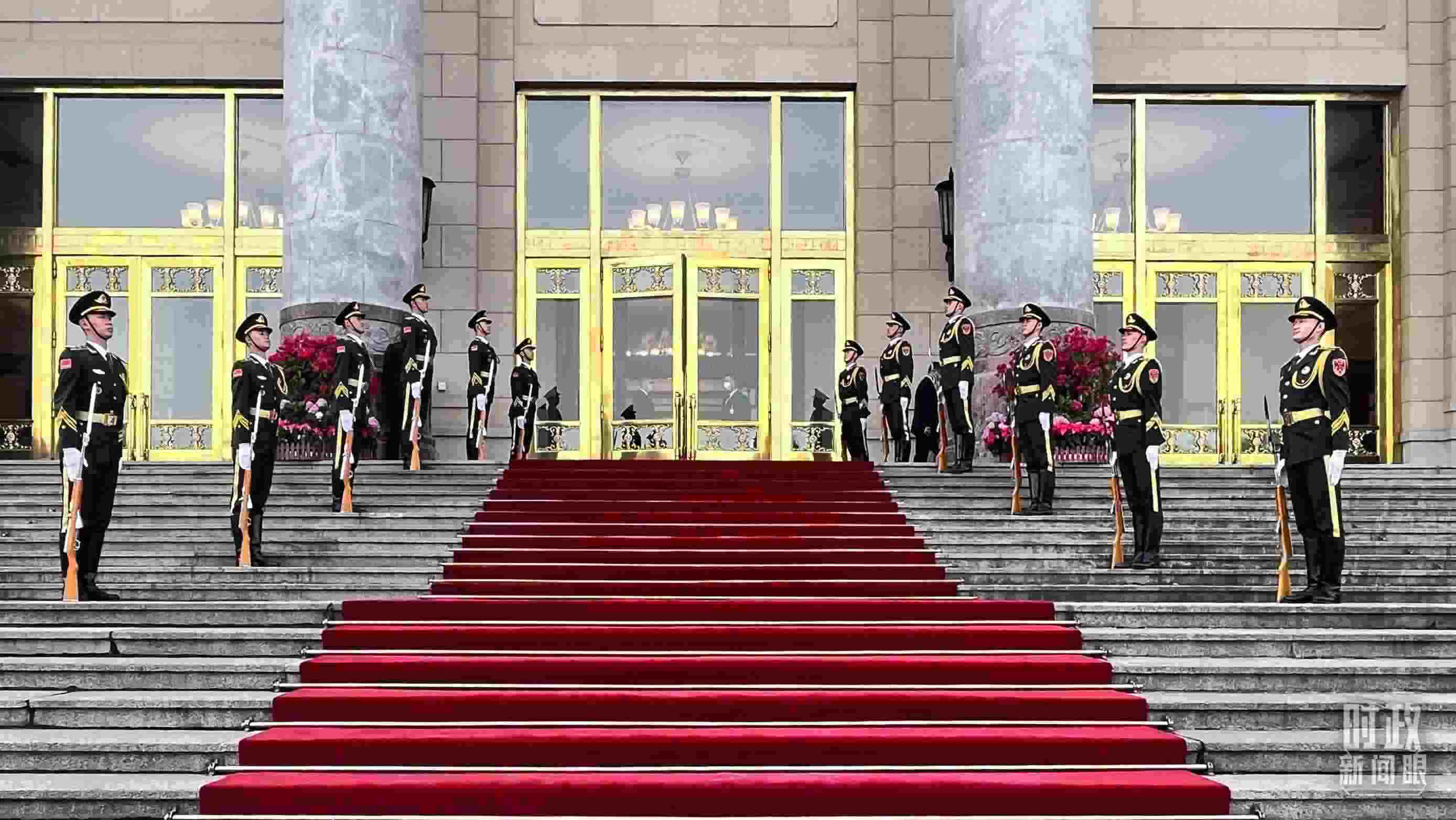 △ 2023年10月17日至20日,習(xí)近平主席在北京人民大會(huì)堂密集會(huì)見了26位外方領(lǐng)導(dǎo)人。圖為禮兵列隊(duì)迎接貴賓。(總臺(tái)央視記者張垚拍攝)