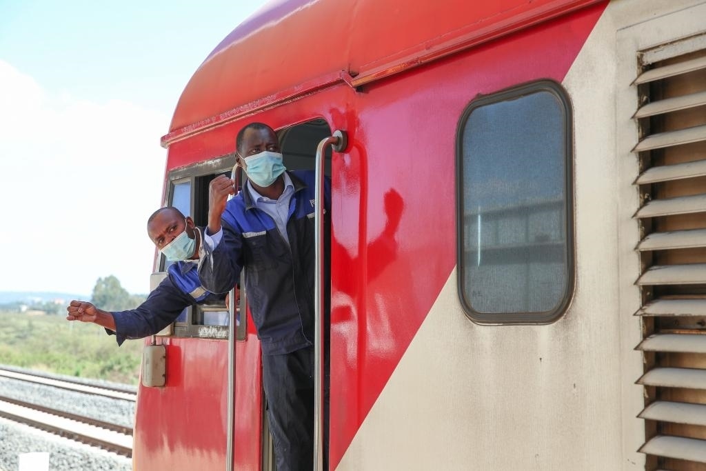 2022年3月25日,在肯尼亞內(nèi)羅畢,蒙內(nèi)鐵路肯方機(jī)車(chē)獨(dú)立班組成員與站臺(tái)工作人員確認(rèn)安全。
