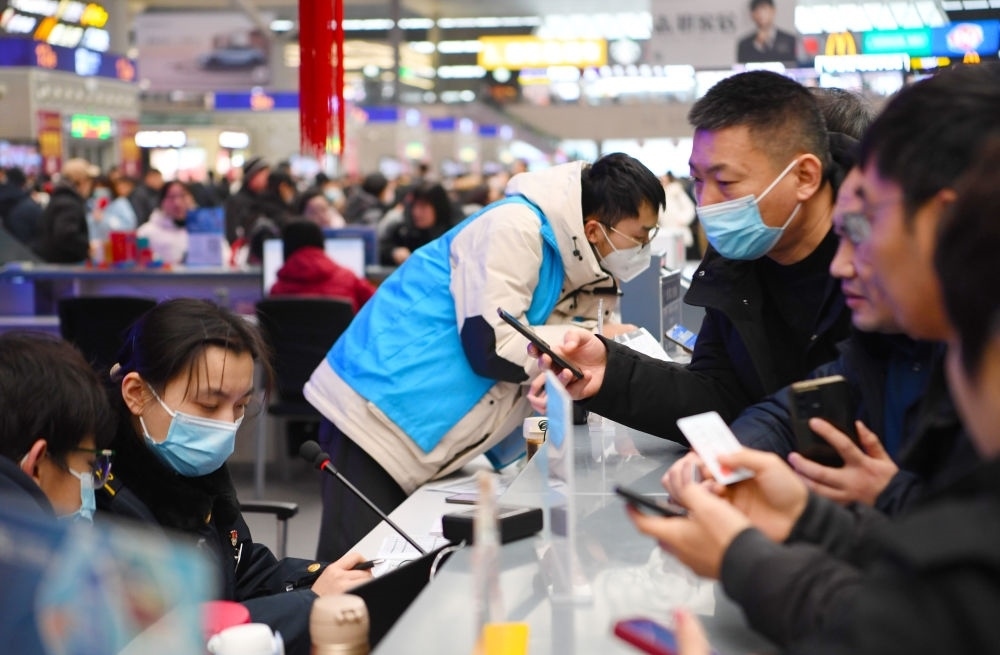 在鄭州東站候車大廳“心馨”黨員服務(wù)臺(tái),旅客在咨詢乘車事宜(2024年2月1日攝)。新華社記者 郝源 攝
