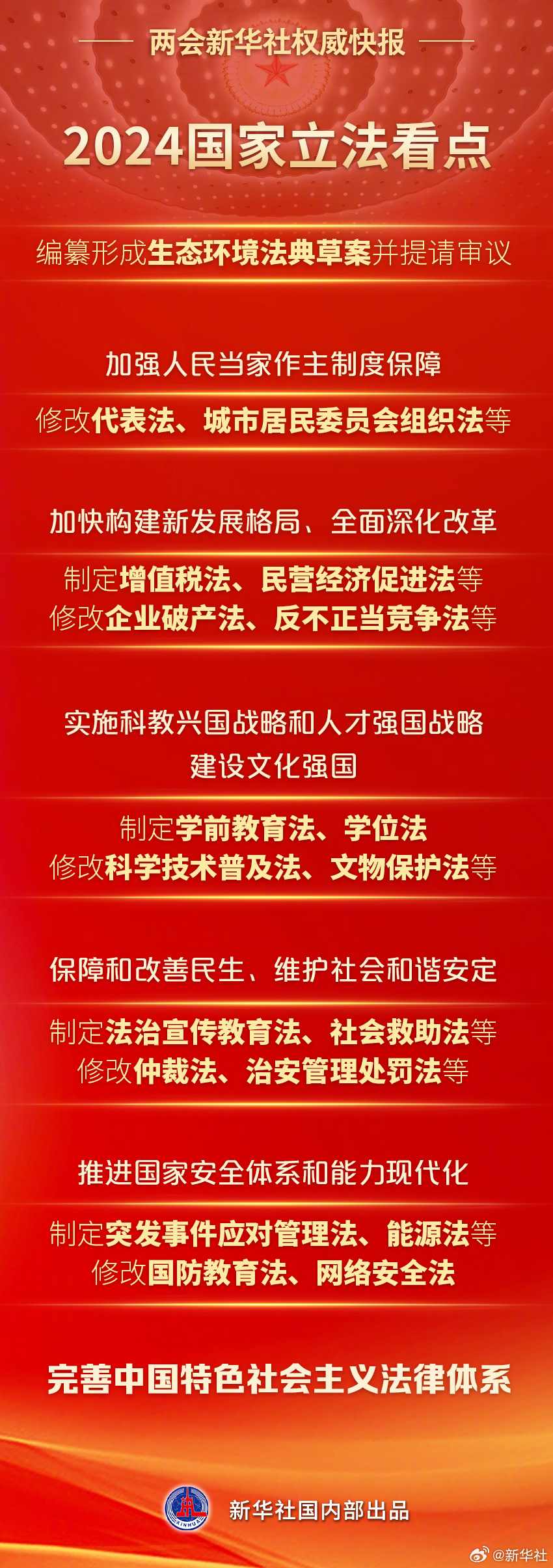 8日提請十四屆全國人大二次會議審議的全國人大常委會工作報告提出,2024年,要認真落實常委會立法規(guī)劃,完善中國特色社會主義法律體系:制定民營經(jīng)濟促進法、學(xué)前教育法、社會救助法等,修改城市居民委員會組織法、文物保護法、網(wǎng)絡(luò)安全法等。