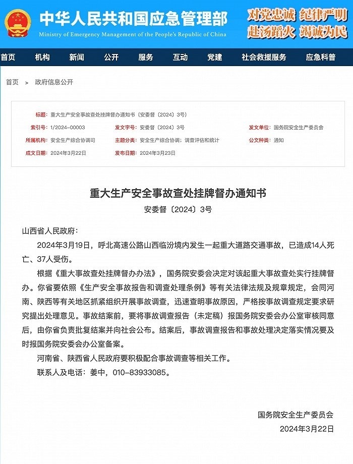 央視網(wǎng)消息:據(jù)應(yīng)急管理部網(wǎng)站消息,國(guó)務(wù)院安全生產(chǎn)委員會(huì)3月22日發(fā)布《重大生產(chǎn)安全事故查處掛牌督辦通知書(shū)》,2024年3月19日,呼北高速公路山西臨汾境內(nèi)發(fā)生一起重大道路交通事故,已造成14人死亡、37人受傷。根據(jù)《重大事故查處掛牌督辦辦法》,國(guó)務(wù)院安委會(huì)決定對(duì)該起重大事故查處實(shí)行掛牌督辦。