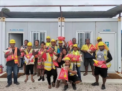 △中國企業(yè)為瑙魯當(dāng)?shù)貑T工發(fā)放節(jié)日慰問品。