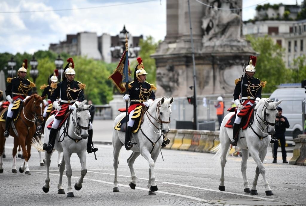 歡迎儀式后,習(xí)近平和夫人彭麗媛在共和國(guó)衛(wèi)隊(duì)148名騎兵組成的禮兵馬隊(duì)和摩托車隊(duì)護(hù)衛(wèi)下,乘車前往愛(ài)麗舍宮。