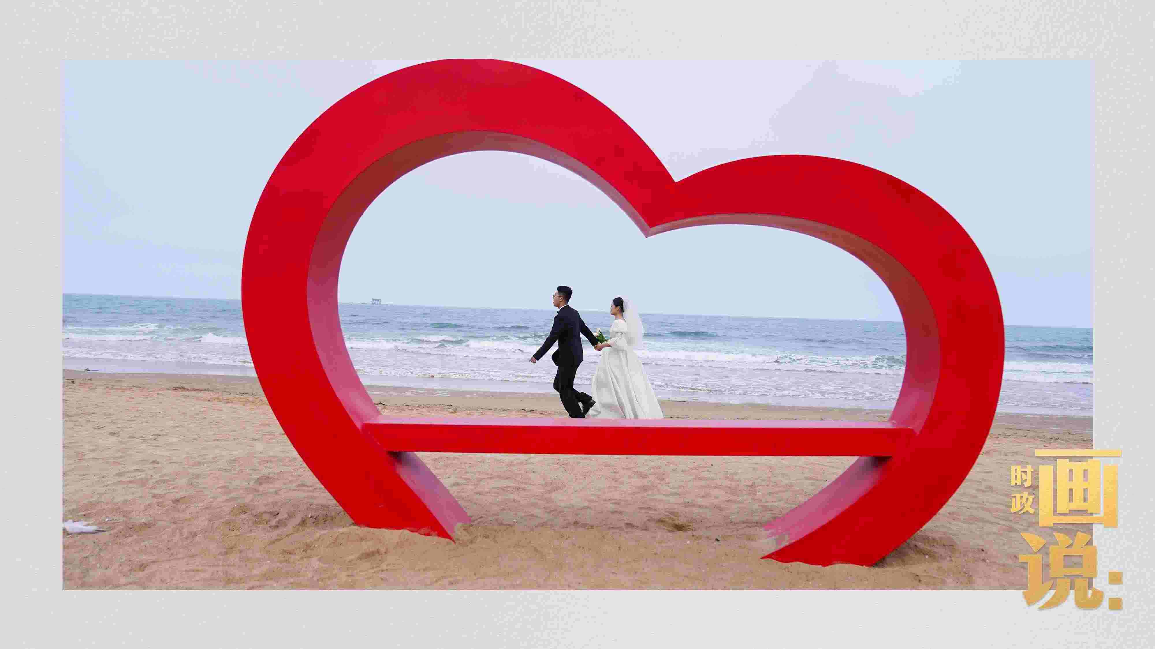 △日照陽光海岸綠道上的萬平口景區(qū),一對(duì)游客在海浪中翩然起舞。