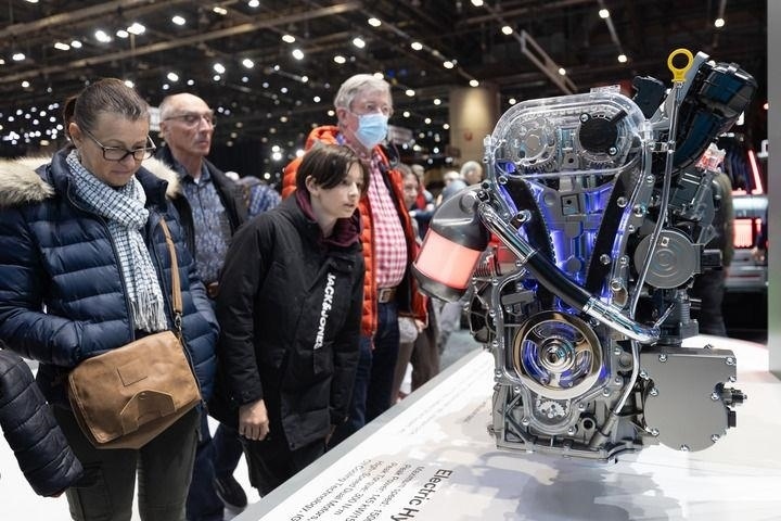 △觀眾在瑞士舉行的2024年日內(nèi)瓦國(guó)際車展上參觀比亞迪新款發(fā)動(dòng)機(jī)。