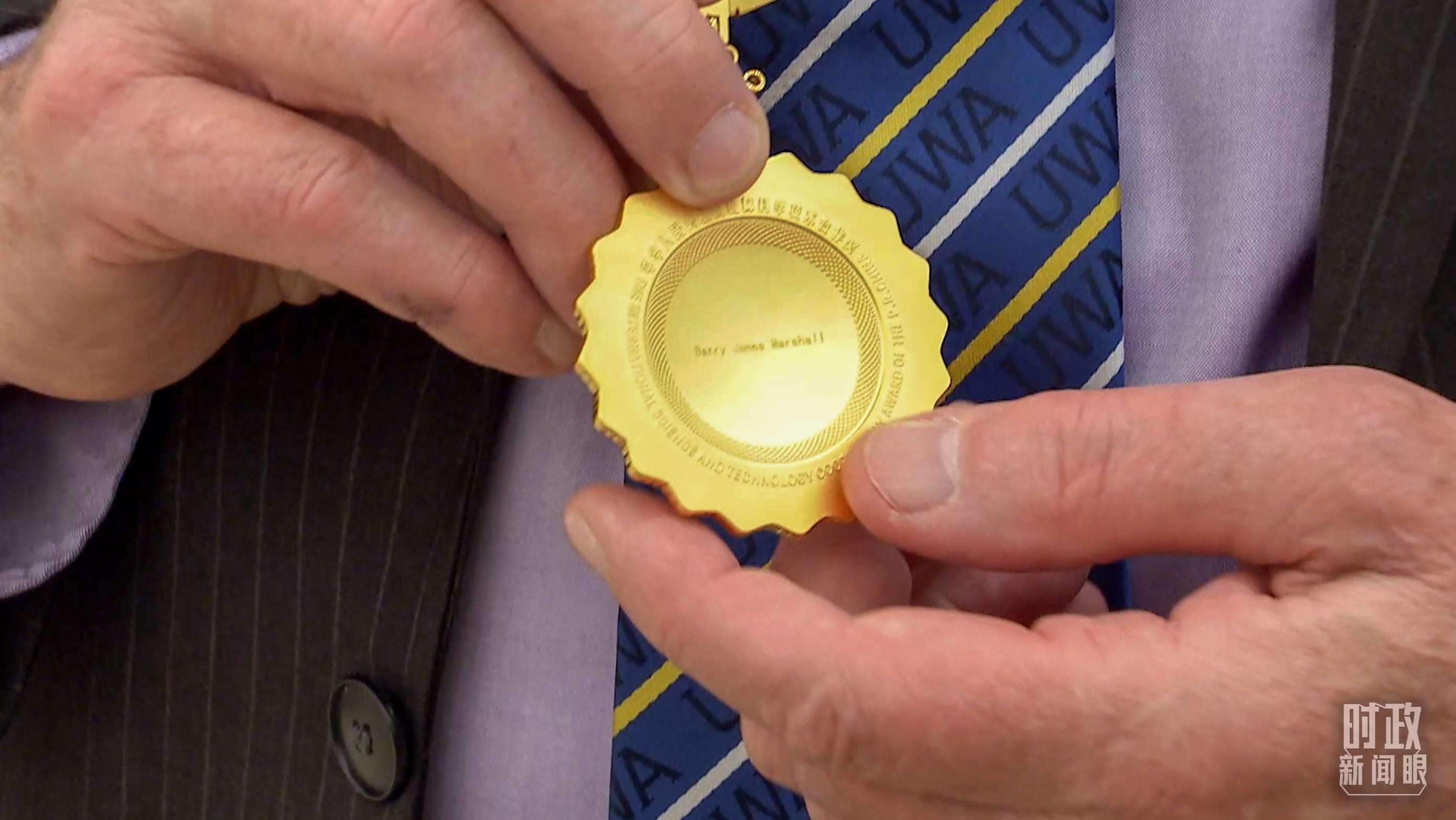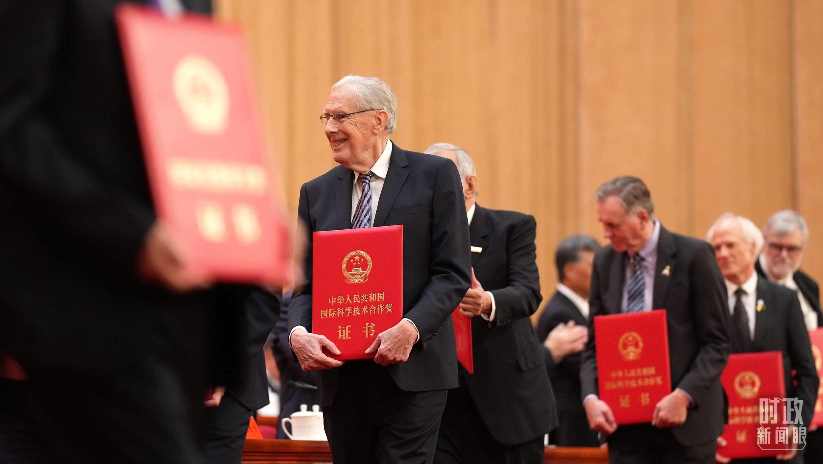 △獲獎的外籍科技工作者,獎?wù)碌谋趁婵逃蝎@獎?wù)咝彰?。(總臺國廣記者李晉、央視記者姚瑤拍攝)