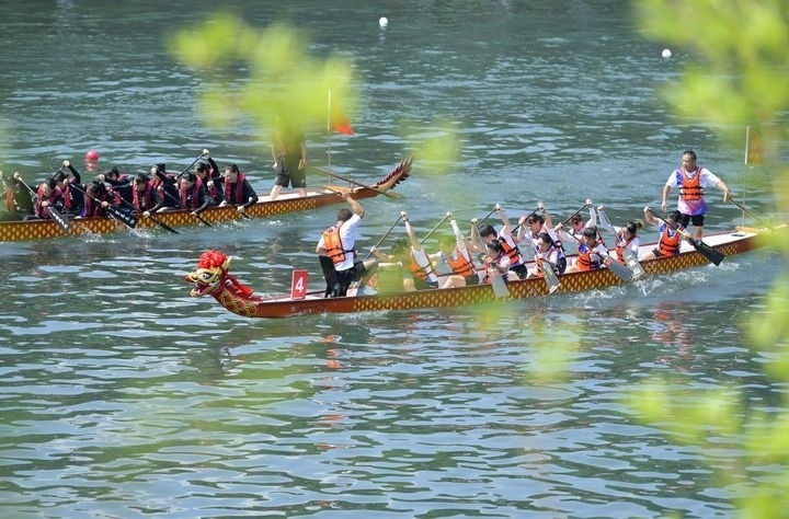 2024年8月10日,湖北省恩施土家族苗族自治州宣恩縣城區(qū)貢水河上,選手在第十二屆全國少數(shù)民族傳統(tǒng)體育運動會“同心暢享”系列活動——全國龍舟邀請賽200米直道賽預(yù)賽中。新華社發(fā)(宋文攝)