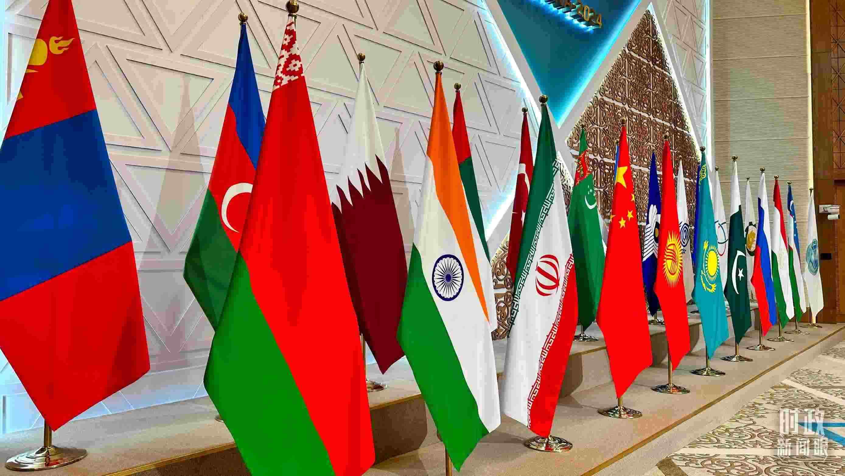 △阿斯塔納峰會現(xiàn)場擺放的旗幟。(總臺央視記者關(guān)舟拍攝)