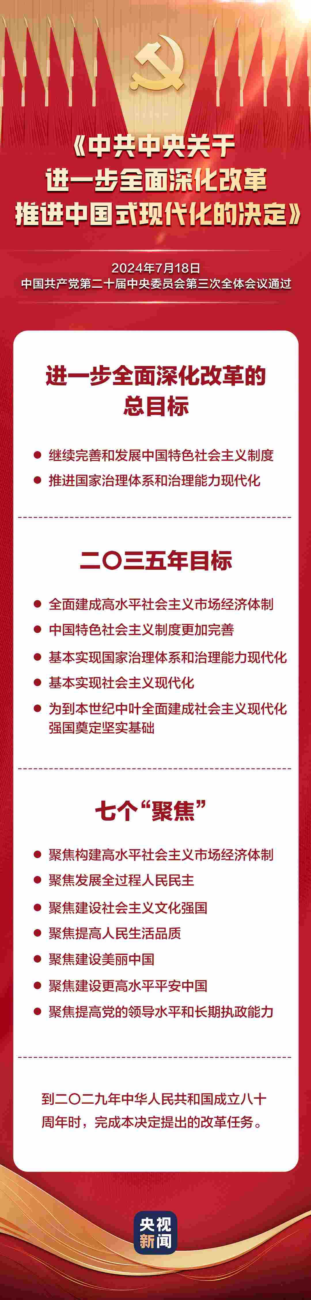 中國共產黨第二十屆中央委員會第三次全體會議,于2024年7月15日至18日在北京舉行。全會最重要的成果是審議通過《中共中央關于進一步全面深化改革、推進中國式現代化的決定》。《決定》共15部分、60條,分三大板塊,一文速覽: