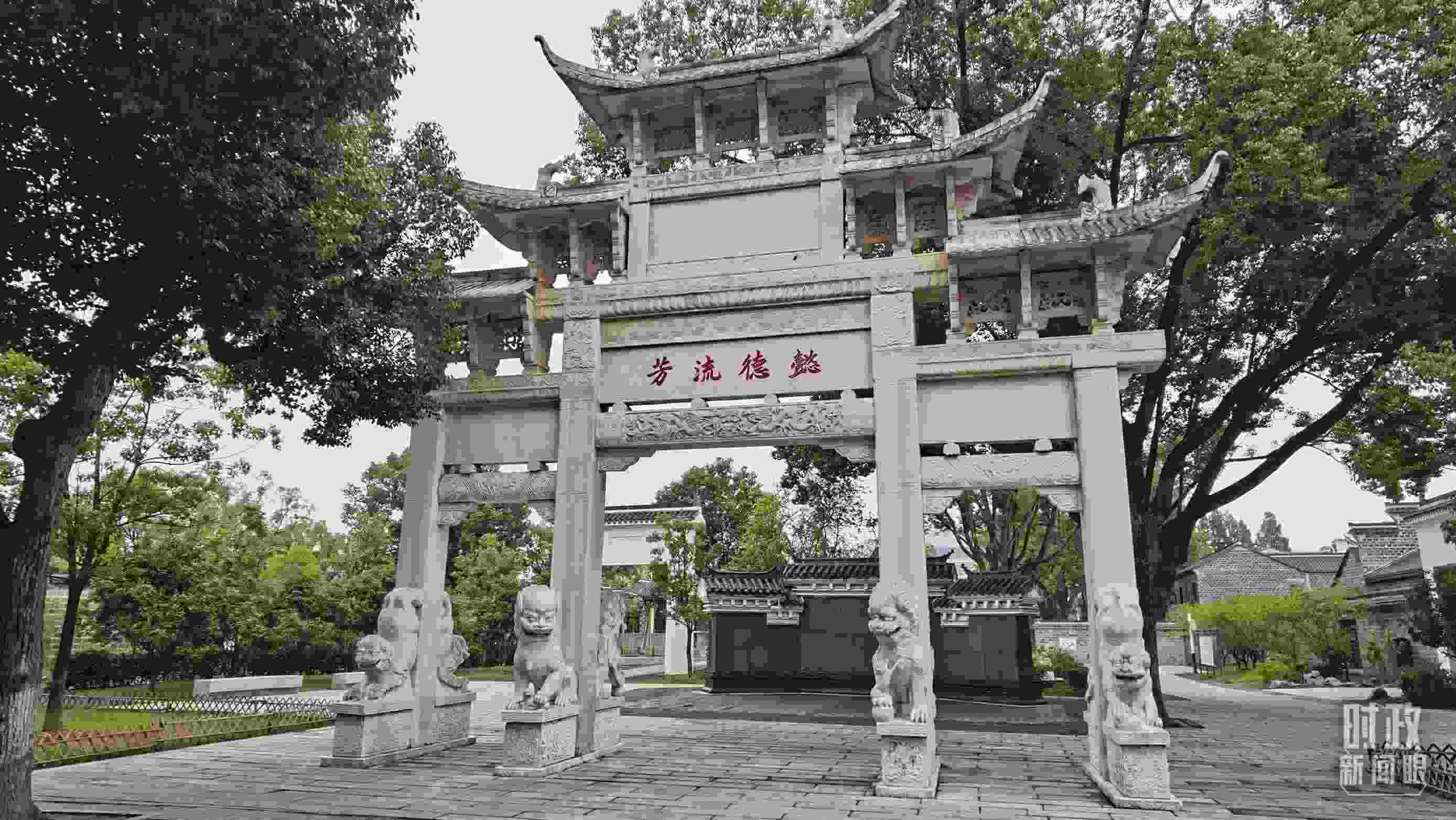 △六尺巷的“懿德流芳”和“禮讓”石牌坊。(總臺央視記者郭鴻、總臺央廣記者馬喆拍攝)