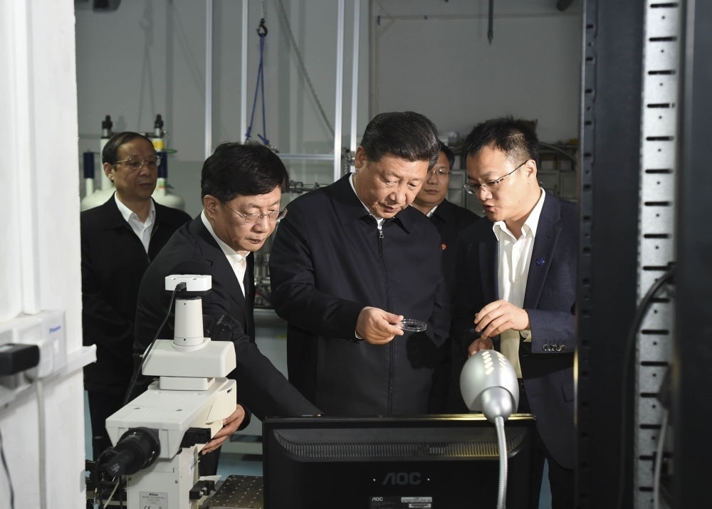 2016年4月26日,習(xí)近平在中國科技大學(xué)近代物理系自旋磁共振實(shí)驗(yàn)室了解科研情況。