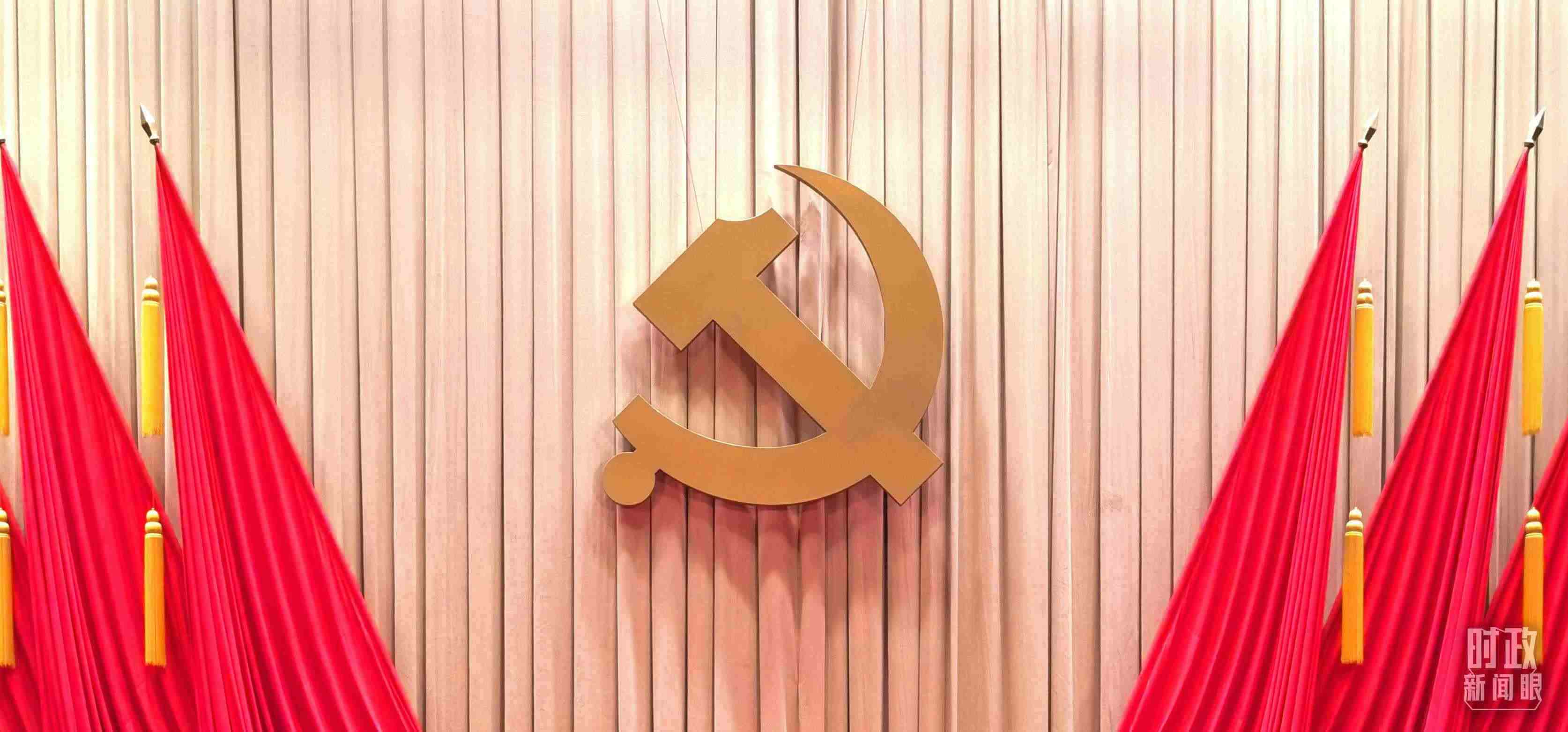 △省部級主要領導干部專題研討班開班式現場懸掛的黨徽。(總臺央視記者郭鴻拍攝)