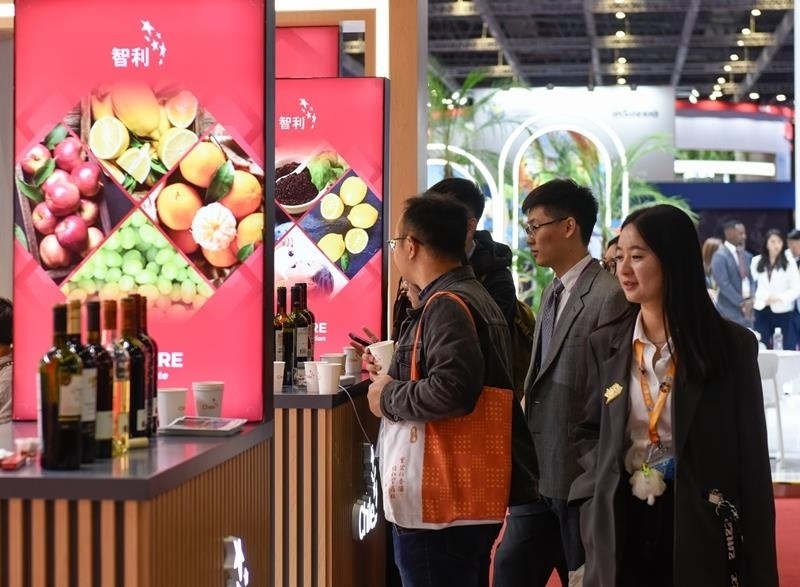 △2024年11月7日,觀眾在第七屆進(jìn)博會國家展上的智利館了解智利紅酒。