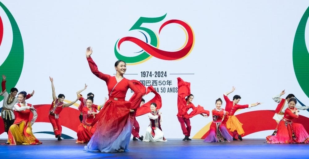△當(dāng)?shù)貢r(shí)間2024年8月15日,在巴西首都巴西利亞,來自北京舞蹈學(xué)院民族舞團(tuán)的演員在慶祝中巴建交50周年招待會上表演。