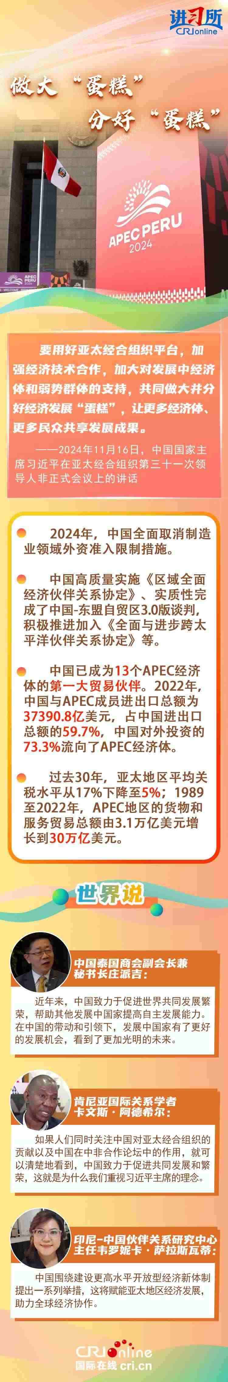 自1991年加入APEC以來(lái),中國(guó)作為關(guān)鍵一員,持續(xù)為亞太地區(qū)成為世界經(jīng)濟(jì)的“火車頭”輸出關(guān)鍵穩(wěn)定力量,習(xí)近平主席表示,“落其實(shí)者思其樹,飲其流者懷其源”。中國(guó)的發(fā)展離不開亞太,也將進(jìn)一步造福亞太。多國(guó)人士表示,在中國(guó)的帶動(dòng)和引領(lǐng)下,發(fā)展中國(guó)家有了更好的發(fā)展機(jī)會(huì),看到了更加光明的未來(lái)。