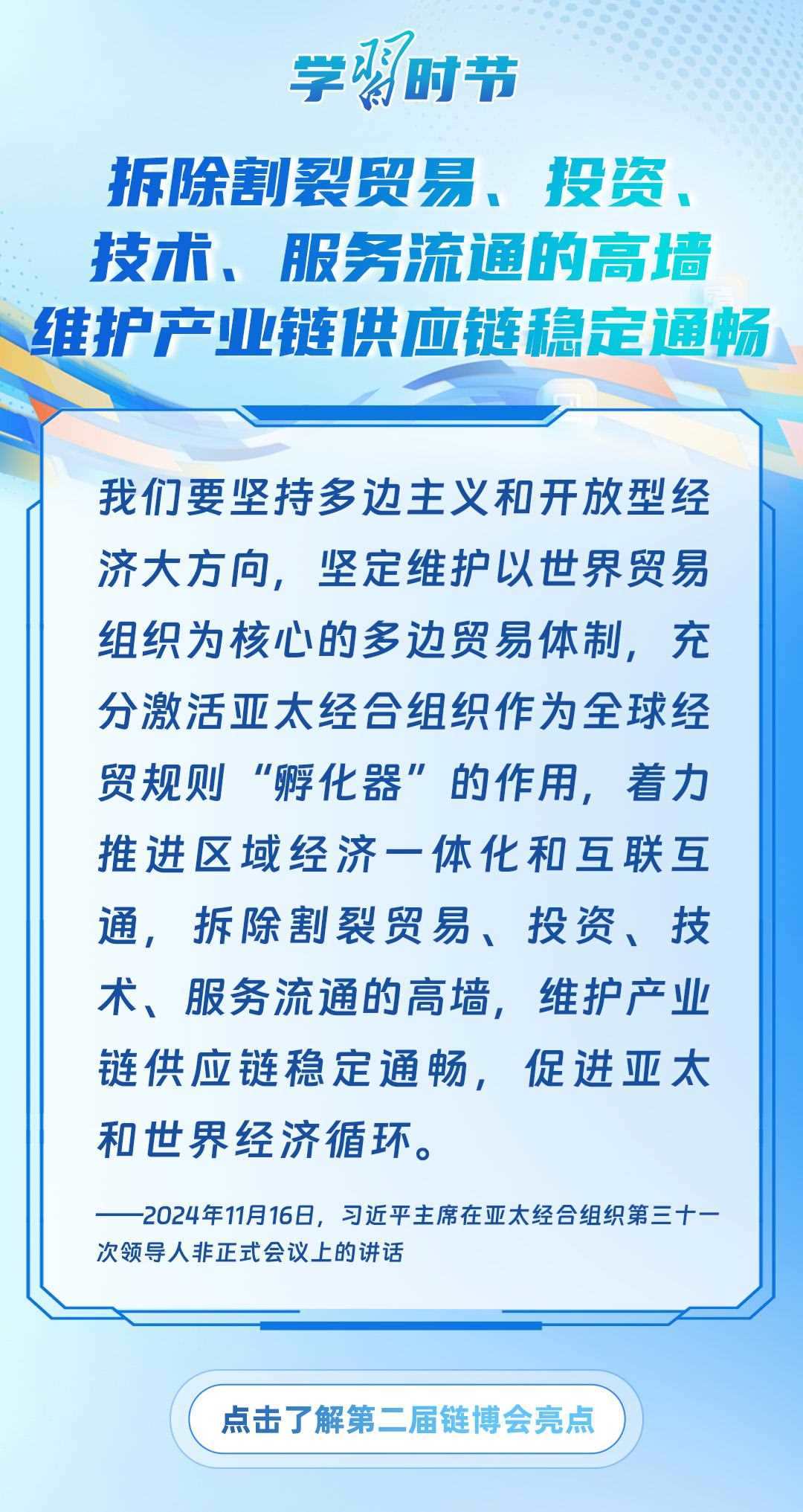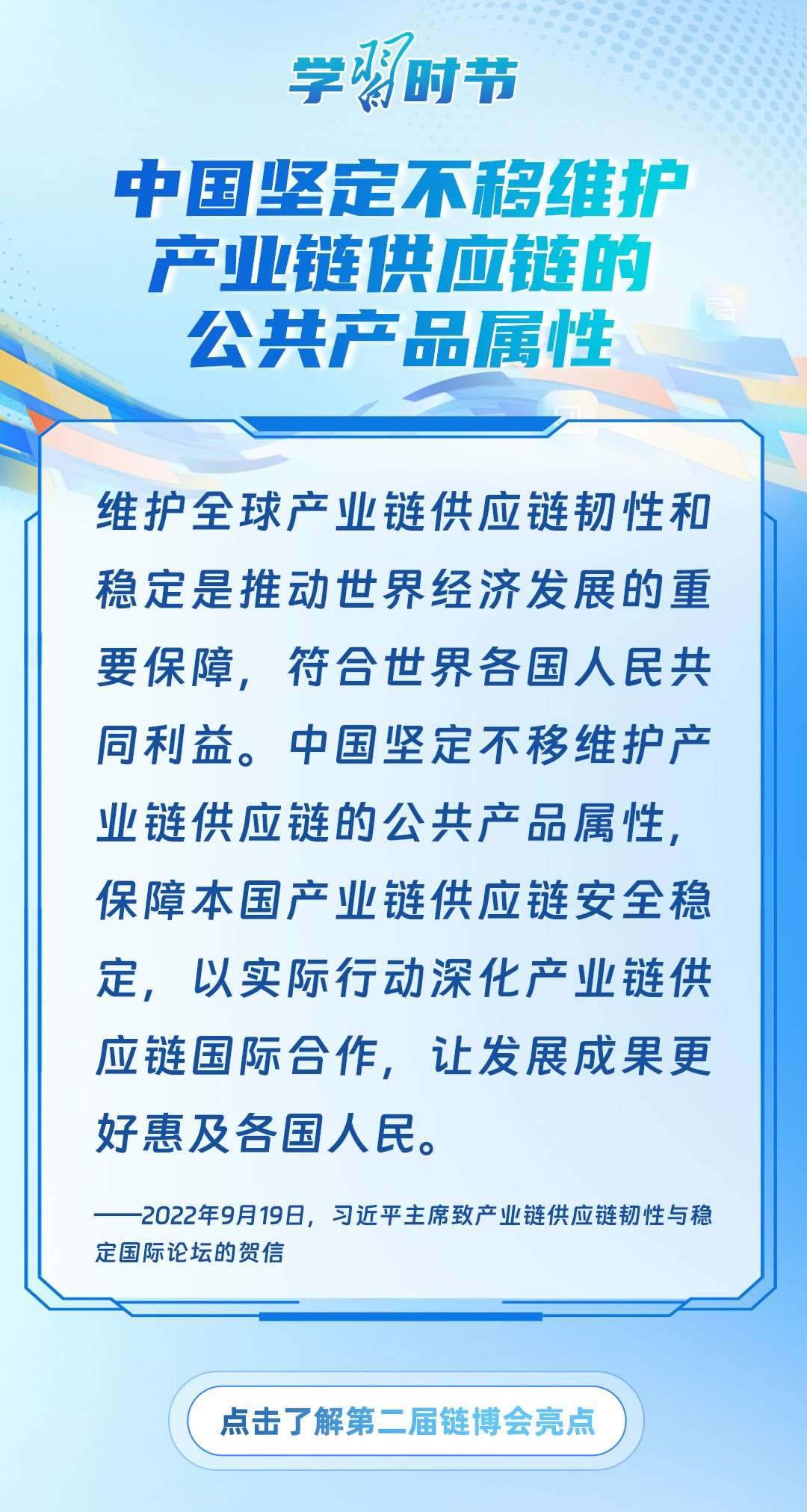 習近平主席心系產業(yè)鏈供應鏈安全穩(wěn)定,多次強調中國將以實際行動維護全球產業(yè)鏈供應鏈安全穩(wěn)定,為世界各國共同構筑安全穩(wěn)定、暢通高效、開放包容、互利共贏的全球產業(yè)鏈供應鏈體系提供中國方案。習近平主席曾在多個重要場合對此作出一系列深刻闡述,讓我們一起學習。