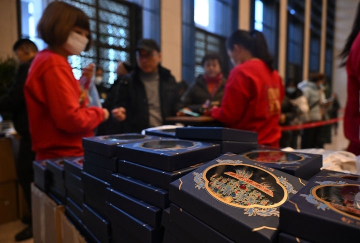 2024年12月3日,觀眾在中國(guó)國(guó)家博物館排隊(duì)購(gòu)買(mǎi)鳳冠冰箱貼。新華社記者 金良快 攝