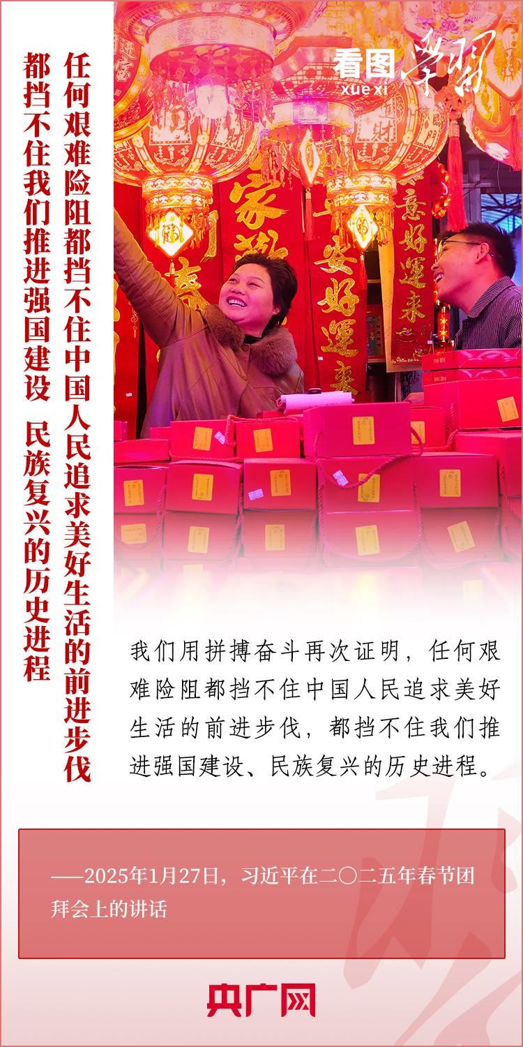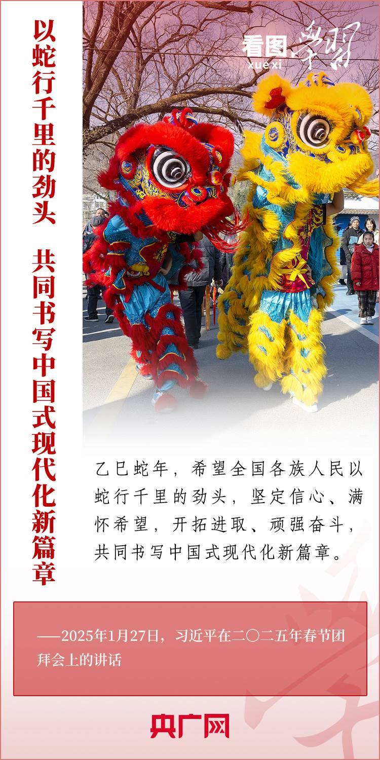 1月27日,中共中央、國務院在北京舉行春節(jié)團拜會,習近平總書記發(fā)表熱情洋溢的講話,向全國各族人民、港澳臺同胞、海外僑胞拜年并致以新春祝福??倳浽谥v話中深情回顧過去一年中國式現(xiàn)代化取得很不平凡的發(fā)展歷程,“希望全國各族人民以蛇行千里的勁頭,堅定信心、滿懷希望,開拓進取、頑強奮斗,共同書寫中國式現(xiàn)代化新篇章?!币黄饋韺W習!