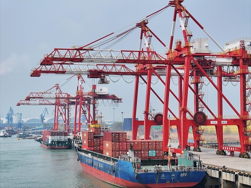 △江蘇揚州港,貨輪靠泊在港口裝卸貨物。