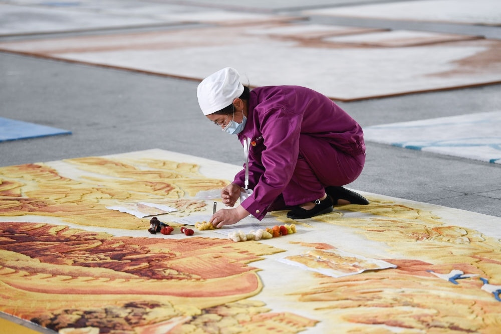 青海湖畔翱翔的水鳥、雪山下起舞的藏族女孩……在圣源地毯集團有限公司車間內(nèi),手持電織槍的女工們,正按照設計圖織出精美立體的圖案。