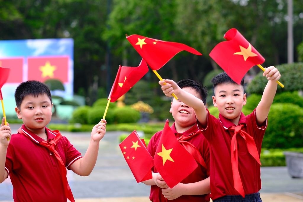 主席府廣場(chǎng)上,五星紅旗同金星紅旗迎風(fēng)飄揚(yáng),200多名越南少年兒童揮舞旗幟,熱烈歡迎習(xí)近平到訪。