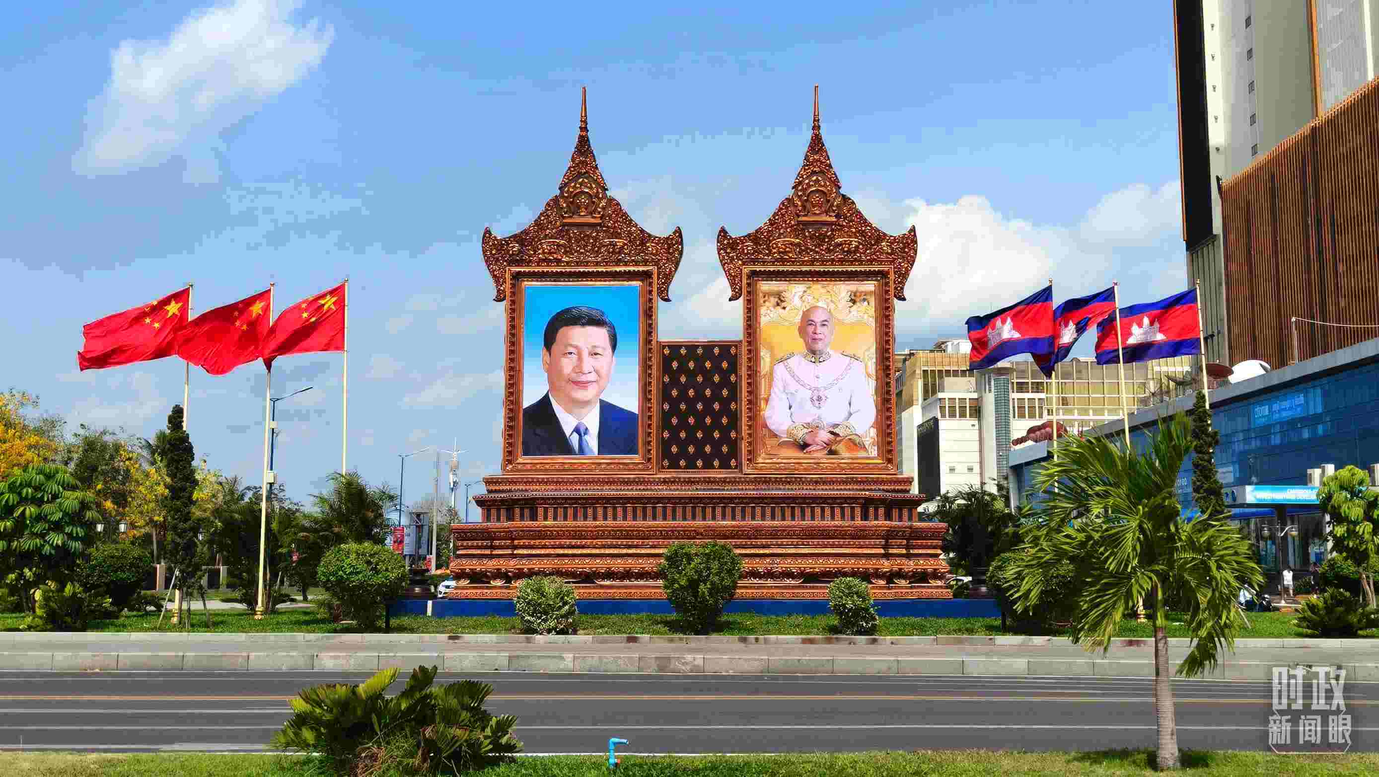 △金邊街頭的巨幅中柬兩國領(lǐng)導(dǎo)人照片和國旗。(總臺(tái)央視記者陸泓宇拍攝)