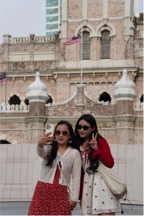 兩名來自中國云南的游客在馬來西亞首都吉隆坡地標(biāo)性歷史建筑蘇丹阿卜杜勒·薩馬德大廈前合影。人民日報記者 俞懿春攝