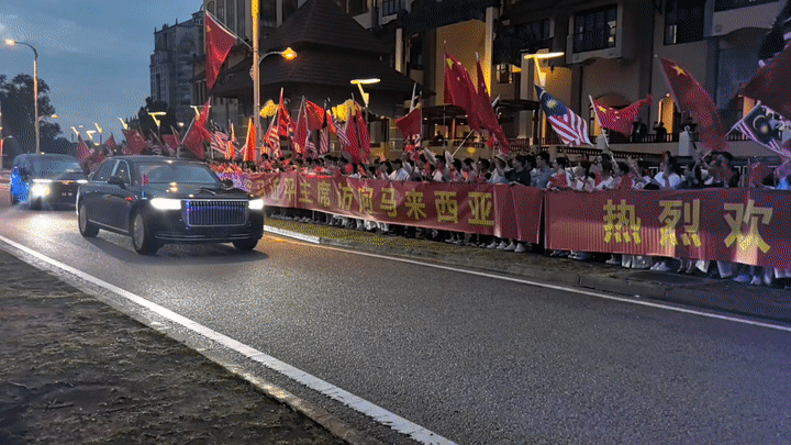習(xí)近平乘車從機(jī)場(chǎng)赴下榻飯店途中,當(dāng)?shù)刂匈Y企業(yè)人員、留學(xué)生在道路兩旁揮舞中馬兩國(guó)國(guó)旗,高舉“熱烈歡迎習(xí)近平主席訪問馬來(lái)西亞”、“中馬友誼萬(wàn)歲”等紅色橫幅,華僑華人表演喜慶熱烈的舞獅,歡迎習(xí)近平到訪。