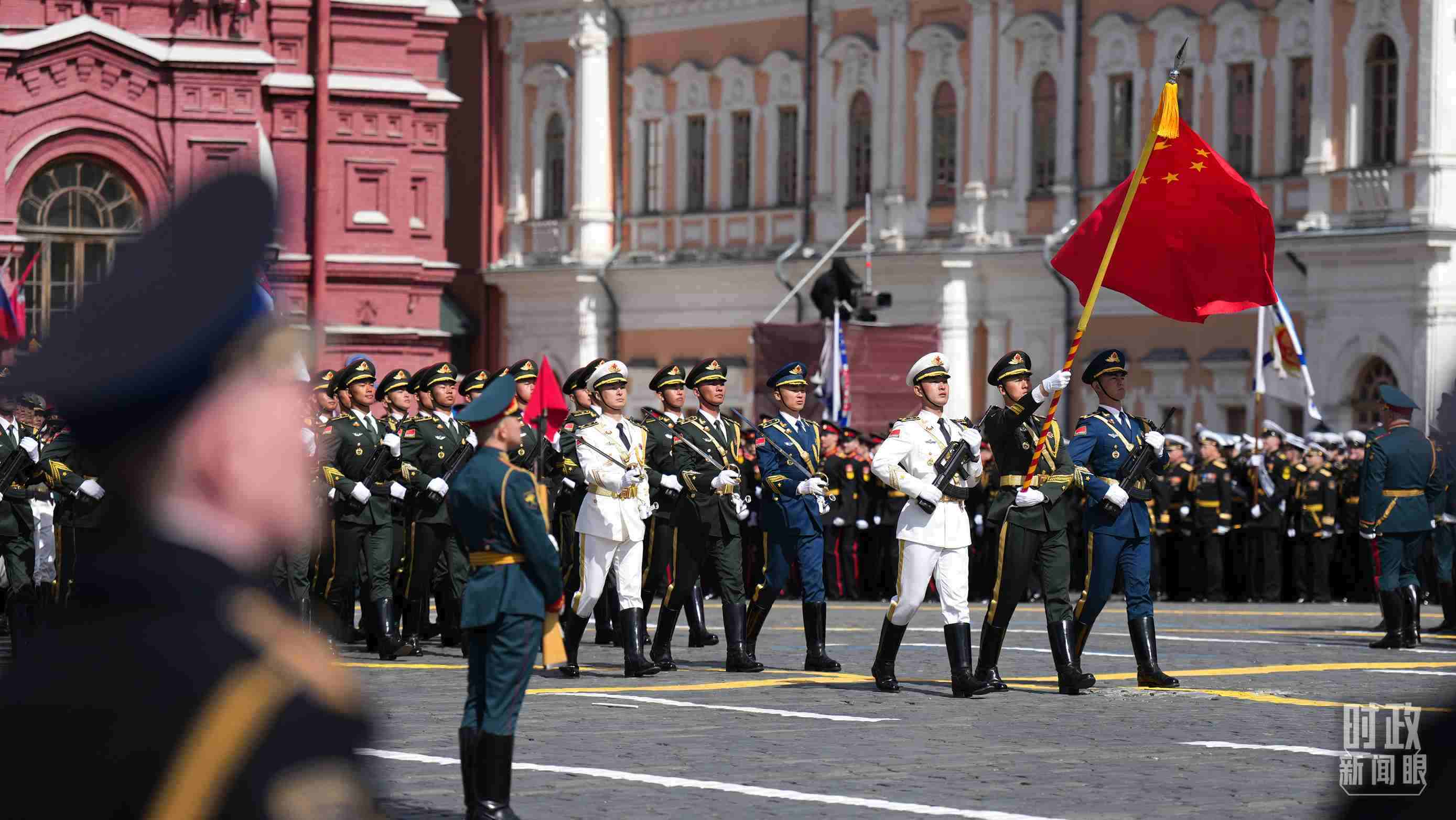 △中國人民解放軍三軍儀仗隊(duì)方隊(duì)軍容嚴(yán)整、士氣高昂,邁著堅定有力的步伐走過紅場。(總臺記者李晉拍攝)