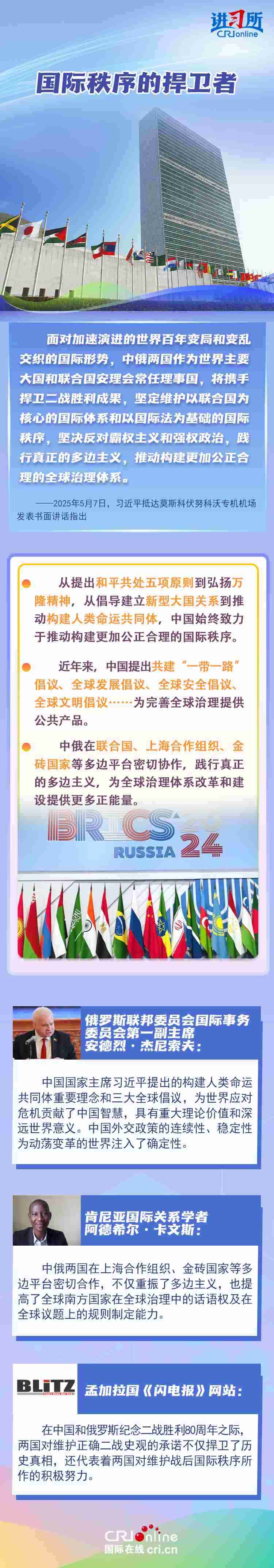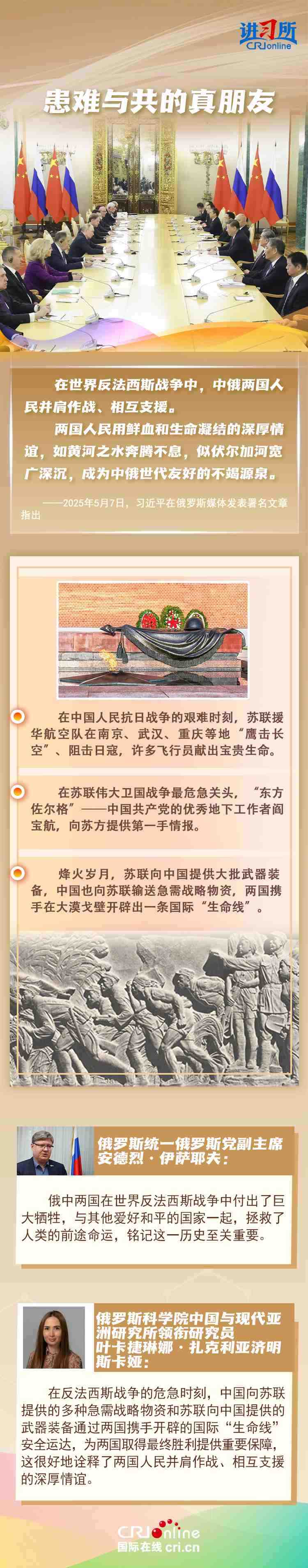 “兩國人民用鮮血和生命凝結(jié)的深厚情誼,如黃河之水奔騰不息,似伏爾加河寬廣深沉,成為中俄世代友好的不竭源泉。”今年是中國人民抗日戰(zhàn)爭、蘇聯(lián)偉大衛(wèi)國戰(zhàn)爭暨世界反法西斯戰(zhàn)爭勝利80周年,也是聯(lián)合國成立80周年。在這一重要歷史時間節(jié)點,習(xí)近平主席此訪不僅為中俄關(guān)系發(fā)展注入強(qiáng)勁動力,也向世界宣示中俄兩國攜手捍衛(wèi)二戰(zhàn)勝利成果的堅定意志。