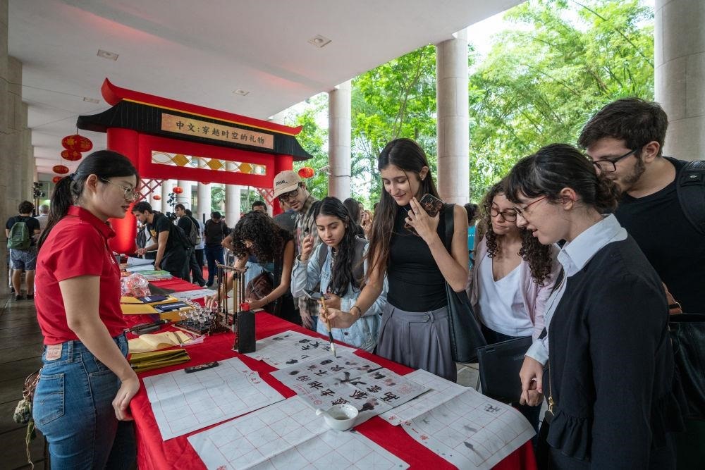 △2025年4月,在巴西里約熱內(nèi)盧天主教大學(xué)舉辦的“國際中文日”慶?;顒?dòng)上,學(xué)生們體驗(yàn)中文書法。