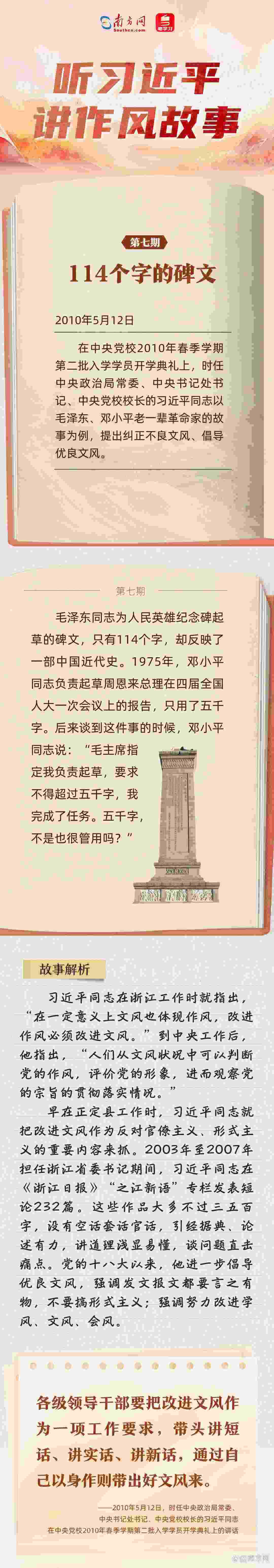 當(dāng)前,全黨上下正在開展深入貫徹中央八項(xiàng)規(guī)定精神學(xué)習(xí)教育,縱深推進(jìn)作風(fēng)建設(shè)。關(guān)于作風(fēng)建設(shè),習(xí)近平總書記常用講故事的方式,傳達(dá)深意、感染他人,給人以思想啟迪。南方網(wǎng)、粵學(xué)習(xí)客戶端推出“聽習(xí)近平講作風(fēng)故事”系列報(bào)道,與您一起感悟這些故事蘊(yùn)含的深刻道理。 今天,推出《聽習(xí)近平講作風(fēng)故事⑦丨114個(gè)字的碑文》,與您一起學(xué)習(xí)毛澤東、鄧小平老一輩革命家的文風(fēng)。