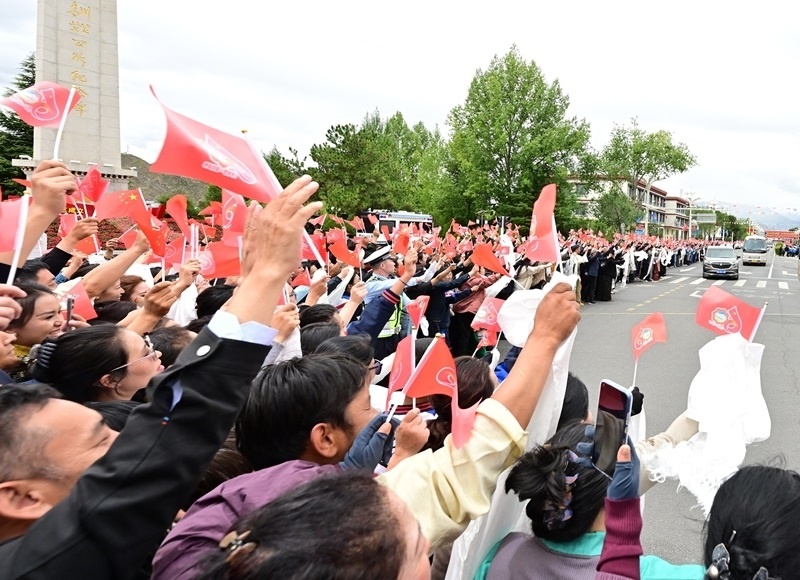 8月20日中午,中共中央總書記、國家主席、中央軍委主席習(xí)近平率中央代表團(tuán)乘專機(jī)抵達(dá)拉薩,出席西藏自治區(qū)成立60周年慶祝活動(dòng)。習(xí)近平等從機(jī)場乘車到住地途中,各族群眾在街道兩旁熱情歡迎。