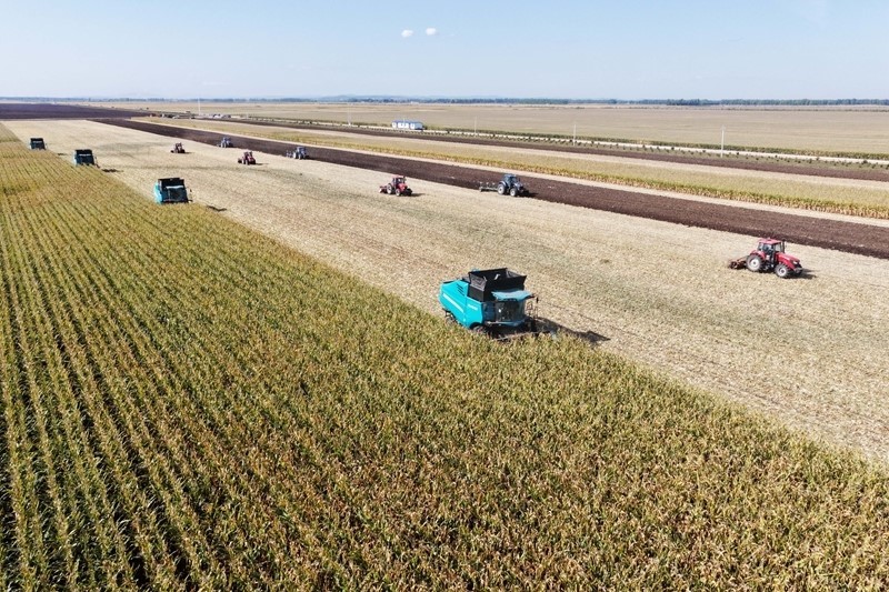 2025年9月23日,在位于雙鴨山市的黑龍江北大荒農(nóng)業(yè)股份有限公司友誼分公司一旱田地塊,大型農(nóng)業(yè)機械在進行玉米收獲作業(yè)(無人機照片)。新華社記者 王松 攝