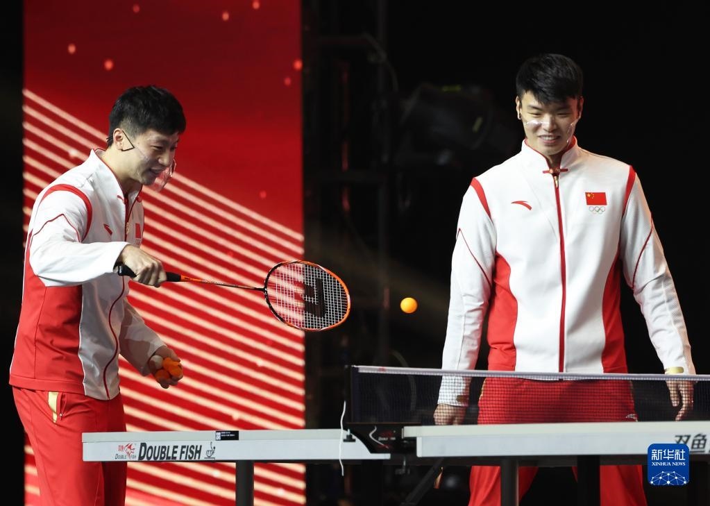 12月20日,內(nèi)地奧運健兒代表團(tuán)成員馬龍(左)與王懿律在活動中參與游戲。